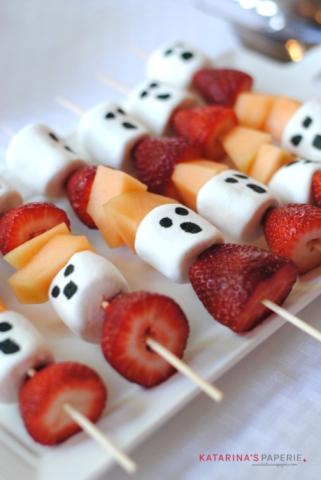 2. Wash and cut the fruit into bite-sized pieces. Add a strawberry, piece of melon and then a ghost marshmallow to the skewer. Repeat the pattern until the skewer is filled.