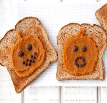 2. Spread 2 tablespoons of pumpkin butter onto each slice of bread in the shape of a pumpkin.