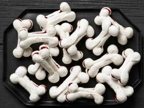 2. Transfer the meringue to a pastry bag fitted with a 3/8-inch round tip. Pipe 3-inch bones onto the prepared baking sheets. Bake, switching the pans halfway through, until the meringues are dry and crisp, 1 1/2 to 2 hours. Transfer to a rack and let cool completely on the baking sheets.