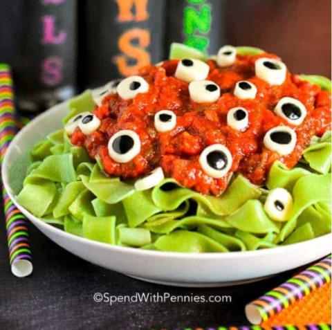 Cook pasta according to directions. Top with a serving of pasta sauce and add eyeballs on top.