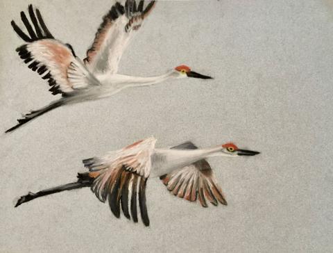 Learn how to create a design of whooping cranes using soft pastels on colored paper. This adult art class is for everyone, from those with no art experience to those with strong art skills! Led by Michelle Stanley of Prairie Art Studio.