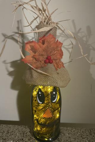 Leap into Fall with this upcycled scarecrow! Use a bottle, raffia, leaves, lights, and paint to make the perfect Fall décor.