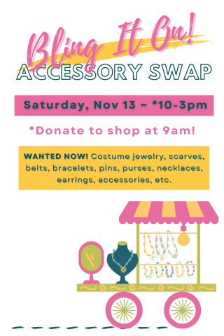DONATIONS WANTED: Costume jewelry, scarves, belts, bracelets, pins, purses, necklaces, earrings, accessories, etc. Your donation entitles you to: 1 Early Access Pass to shop the swap at *9am (before the general public) and 1 entry for a chance to win a special raffle prize! Donations must be clean and in good condition. 1 Early Access Pass required for each person shopping at 9am.