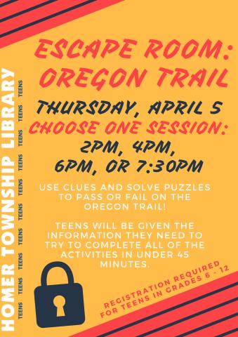 The 6pm session of the Escape Room: Oregon Trail program has been cancelled. Please join us for a different session!