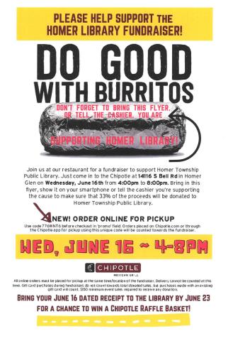 Mention Homer Library or present the flyer on this page when you order at Chipotle in Homer Glen on Wednesday, June 16 between 4-8pm! For this fundraiser, 33% of the proceeds will be donated to the library!