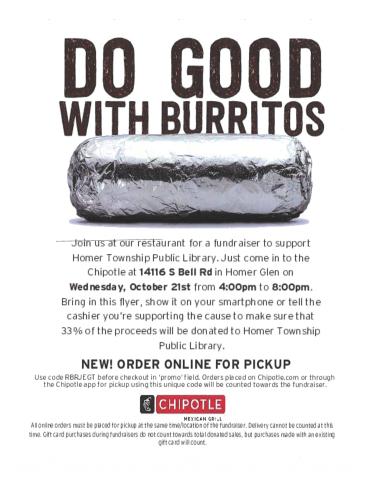 Mention Homer Library or present the flyer on this page when you order at Chipotle in Homer Glen on Wednesday, October 21 between 4-8pm! For this fundraiser, 33% of the proceeds will be donated to the library!