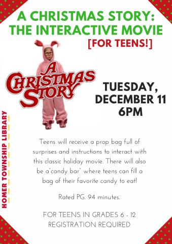 Watch A Christmas Story while you shout, scream, and snack along with it! Teens will receive a prop bag full of surprises and instructions to interact with this classic holiday movie. There will also be a “candy bar” where teens can fill a bag of their favorite candy to eat! Rated PG. 94 minutes.