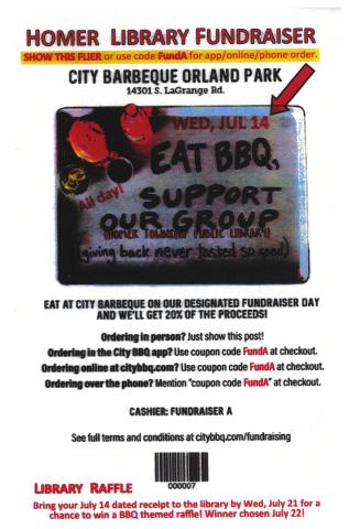 Mention Homer Library or present the flyer on this page when you order at City Barbeque in Orland Park on Wednesday, July 14! For this fundraiser, 20% of the proceeds will be donated to the library!