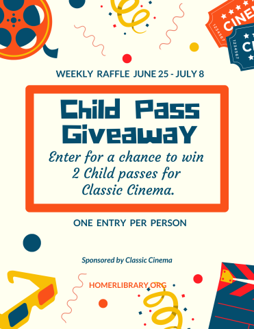 Stop by the library between June 25 -- July 8 and enter for a chance to win 2 child passes for Classic Cinema! One entry per person. Sponsored by Classic Cinema.