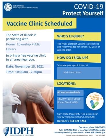 The State of Illinois in patrnership with Homer Township Public Library is offering a free COVID-19 vaccine clinic. All vaccines available. Walk-ins accepted.