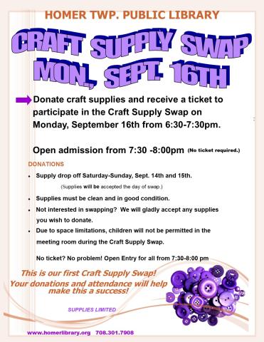 Supplies can be dropped off at the library on Saturday, September 14th and Sunday, September 15th, during business hours. (supplies will be accepted the day of the swap.)