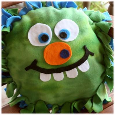 Just in time for Halloween but these puffy monster pillows were never meant to scare! Cut and tie fleece project.