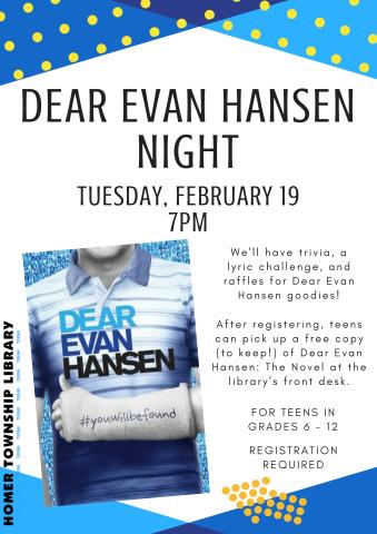 Celebrate Dear Evan Hansen’s arrival in Chicago! After registering, teens can pick up a free copy (to keep!) of Dear Evan Hansen: The Novel at the library’s front desk. We’ll talk about our favorite parts of the book at the program (Didn’t finish the book? That’s okay! Come anyway!). There will also be trivia, a lyric challenge, and raffles for Dear Evan Hansen goodies!