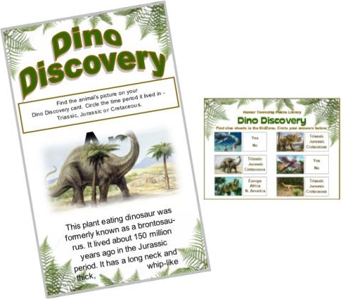 Pick up a Dino Discovery card and find clue sheets in the KidZone. Turn in your completed Dino Discovery card to the Youth Services desk for a chance to win a Jurassic World piñata!