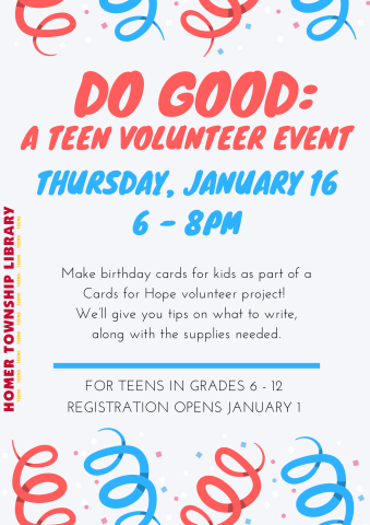 Make birthday cards for kids as part of a Cards for Hope volunteer project! We’ll give you tips on what to write, along with the supplies needed. Service hours will be provided.