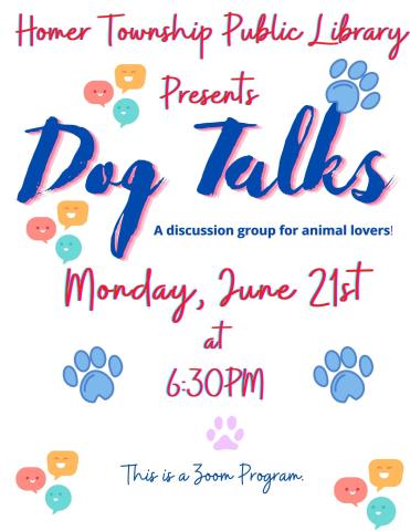 Do you love dogs? Well this is an event for you! Join us for our new series for animal lovers! Dog Talks is a casual discussion group for people who share a love for our canine friends! Bring your tips, stories, and questions to our friendly discussion group. We will be raffling off one prize and all who register and attend this program will be entered into the drawing.* Dogs are welcome to attend!