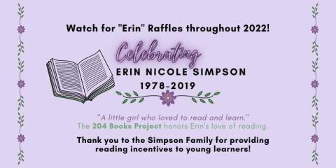 Stop by the library for a chance to win an "Erin" raffle, offered in honor of Erin Nicole Simpson. The 204 Books Project honors Erin's love of reading.