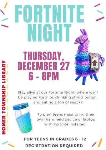 Stay alive at our Fortnite Night, where we’ll be playing Fortnite, drinking shield potion, and eating a ton of snacks! To play, teens must bring their own handheld device or laptop with Fortnite installed.