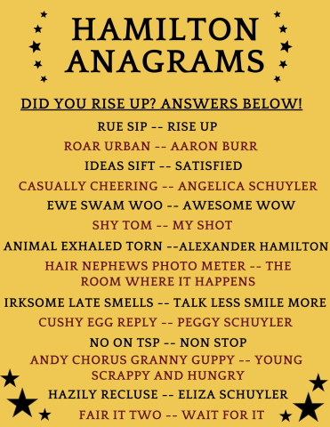 Don't throw away your shot! Unscramble anagrams to reveal Hamilton characters, songs, & phrases! Entries with at least 7 correct answers will be entered into a drawing to receive a $25 Meijer gift card. One entry per family. Drawing is open to patrons of the Homer Township Public Library only.