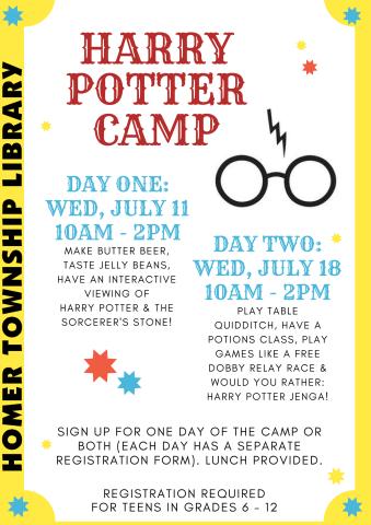 During day one of Harry Potter Camp, we’ll make butter beer, taste odd flavored jelly beans, have an interactive viewing of Harry Potter and the Sorcerer’s Stone, and more! Lunch will be provided -- please email any food restrictions to teens@homerlibrary.org.