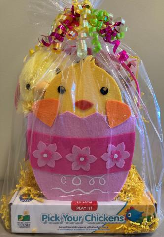 Enter for a chance to win a chick themed kids raffle! Prize includes Pick Your Chickens matching game, plush chicken, books, & more!