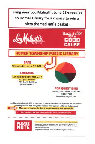 It's time for the library's annual Lou Malnati’s fundraiser! If you order from Lou’s during Wednesday June 23 between 4-10pm, mention the Homer Library Fundraiser and 20% of total sales will go to the Homer Library!