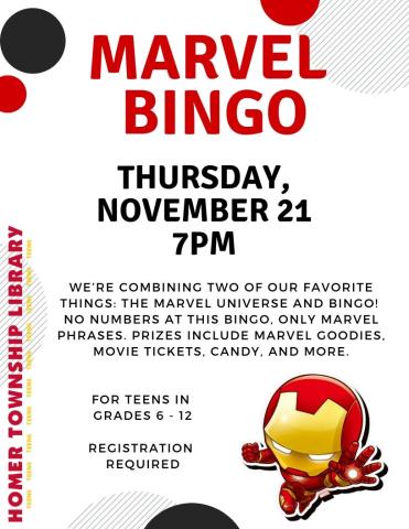 We’re combining two of our favorite things: the Marvel Universe and bingo! No numbers at this bingo, only Marvel phrases. Prizes include Marvel goodies, movie tickets, candy, and more.
