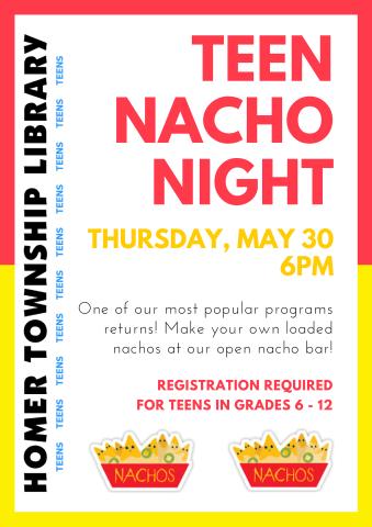 It’s the return of our popular nacho night! This is one of our favorite programs for a reason: there will be an open nacho bar with all of the good stuff needed to make your own plate full of loaded nachos. Be sure to come hungry!