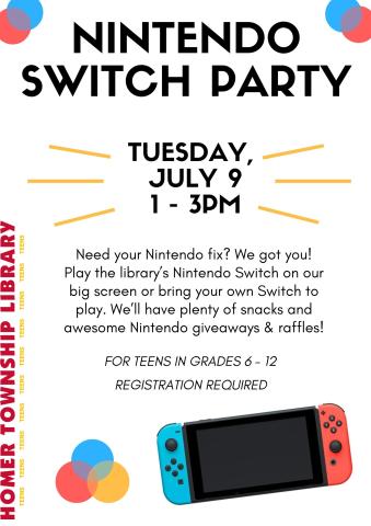 Need your Nintendo fix? We got you! Play the library’s Nintendo Switch on our big screen or bring your own Switch to play. We’ll have plenty of snacks and awesome Nintendo giveaways and raffles!