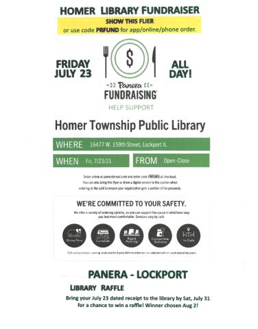 Mention Homer Library or present the flyer on this page when you order at Panera in Lockport on Friday, July 23! For this fundraiser, proceeds will be donated to the library!