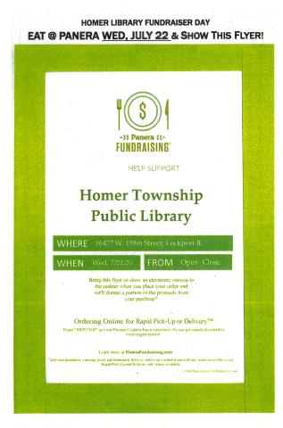 Treat yourself to delcious food & support the library at the same time! If you order from Panera in Lockport on Wednesday July 22, mention the Homer Library Fundraiser & show the flyer on this webpage and a portion of total sales will go to the Homer Library!