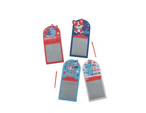 Here’s a doodle pad that can be used again and again! This cute animal crew are a patriotic bunch. Their clever slogans show their pride for their country!
