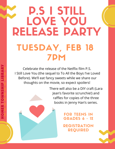 Celebrate the release of the Netflix film P.S. I Still Love You (the sequel to To All the Boys I’ve Loved Before). We’ll eat fancy sweets while we share our thoughts on the movie, so expect spoilers! There will also be a DIY craft (Lara Jean’s favorite scrunchie!) and raffles for copies of the three books in Jenny Han’s series.