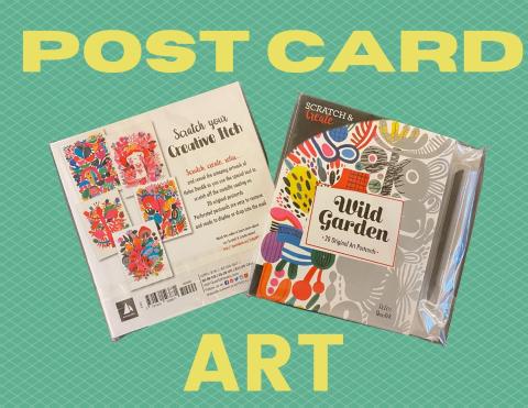 Make your own postcard art! This is a fun Take and Make craft for adults! Each kit includes 20 original art postcards and a scratchpen. Using the scratch pen you can gently reveal and create beautiful postcards.