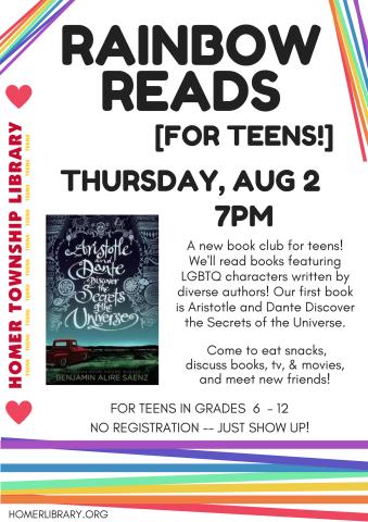 A new teen book club where we read books featuring LGBTQ characters written by diverse authors! Come to eat snacks, discuss books, tv, & movies, and meet new friends.
