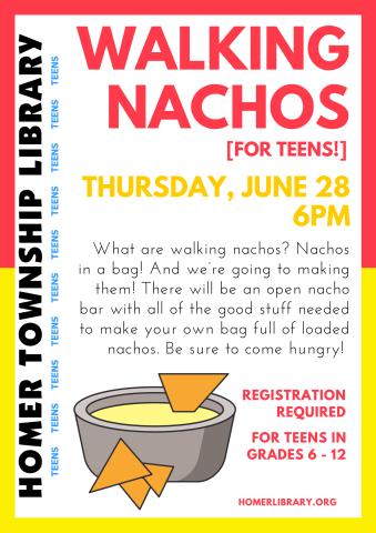 What are walking nachos? Nachos in a bag! And we’re going to making them! There will be an open nacho bar with all of the good stuff needed to make your own bag full of loaded nachos. Be sure to come hungry! For teens in grades 6-12. Registration required.