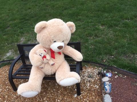 Look closely where the Library Bear is pointing and you will see a nest on the ground with three Killdeer bird eggs waiting to hatch! Please be kind to the nesting bird if you happen to visit the Art Garden at the library.