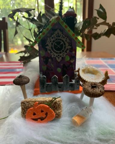 Use natural elements to create a spooky atmosphere for a miniature Halloween house.