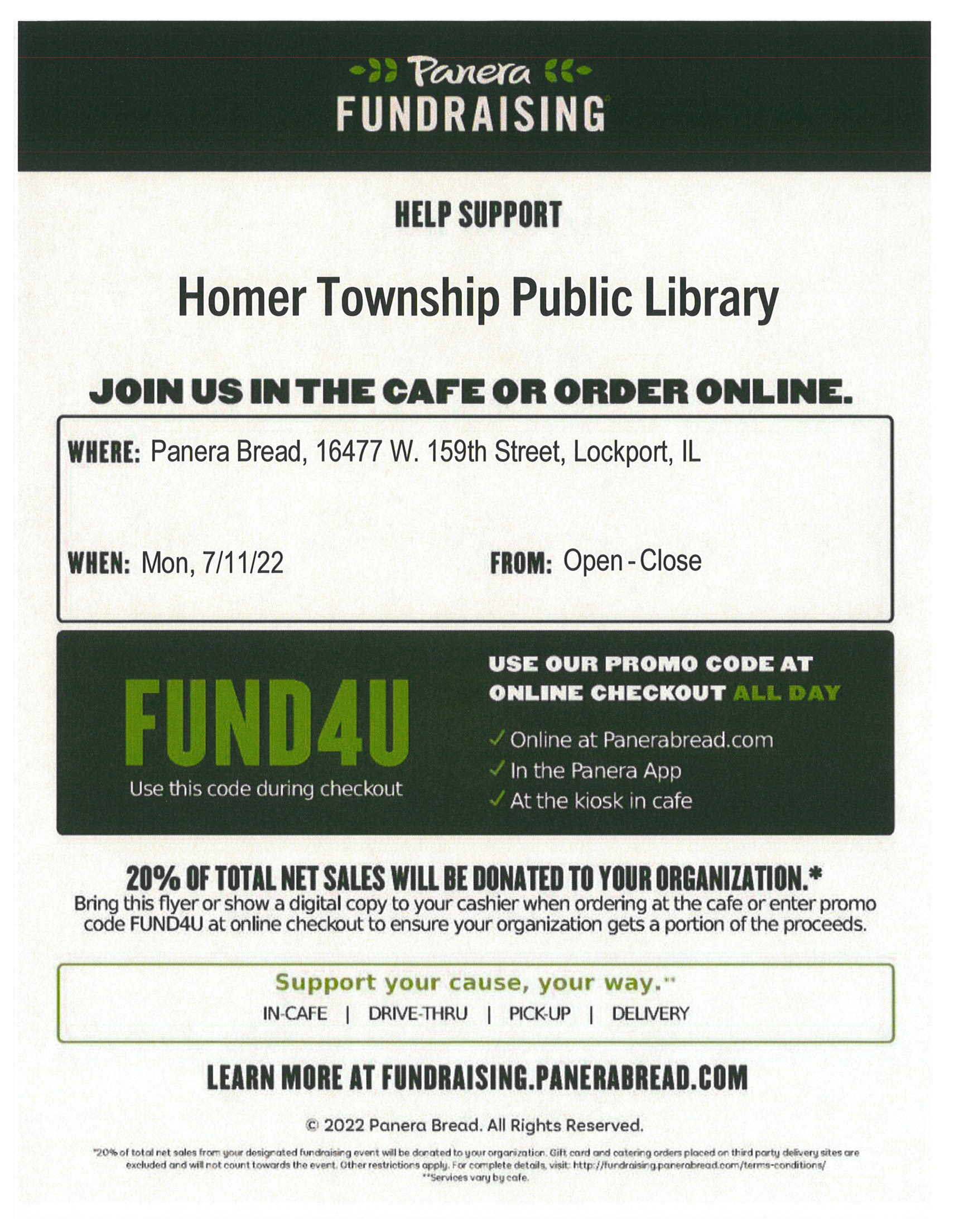 It's time for the library's Panera fundraiser! If you order from (Lockport) Panera all day Monday July 11th, mention the Homer Library Fundraiser