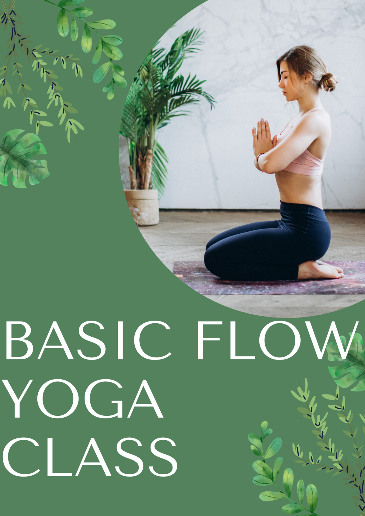 Basic Flow Yoga with a green background and woman sitting on yoga mat